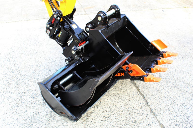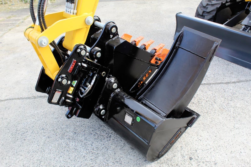 Attachments: Elite Rotalock tilt hitch, Olsen Attach 1100mm wide bucket, 450mm dig bucket, 300mm shallow spade
